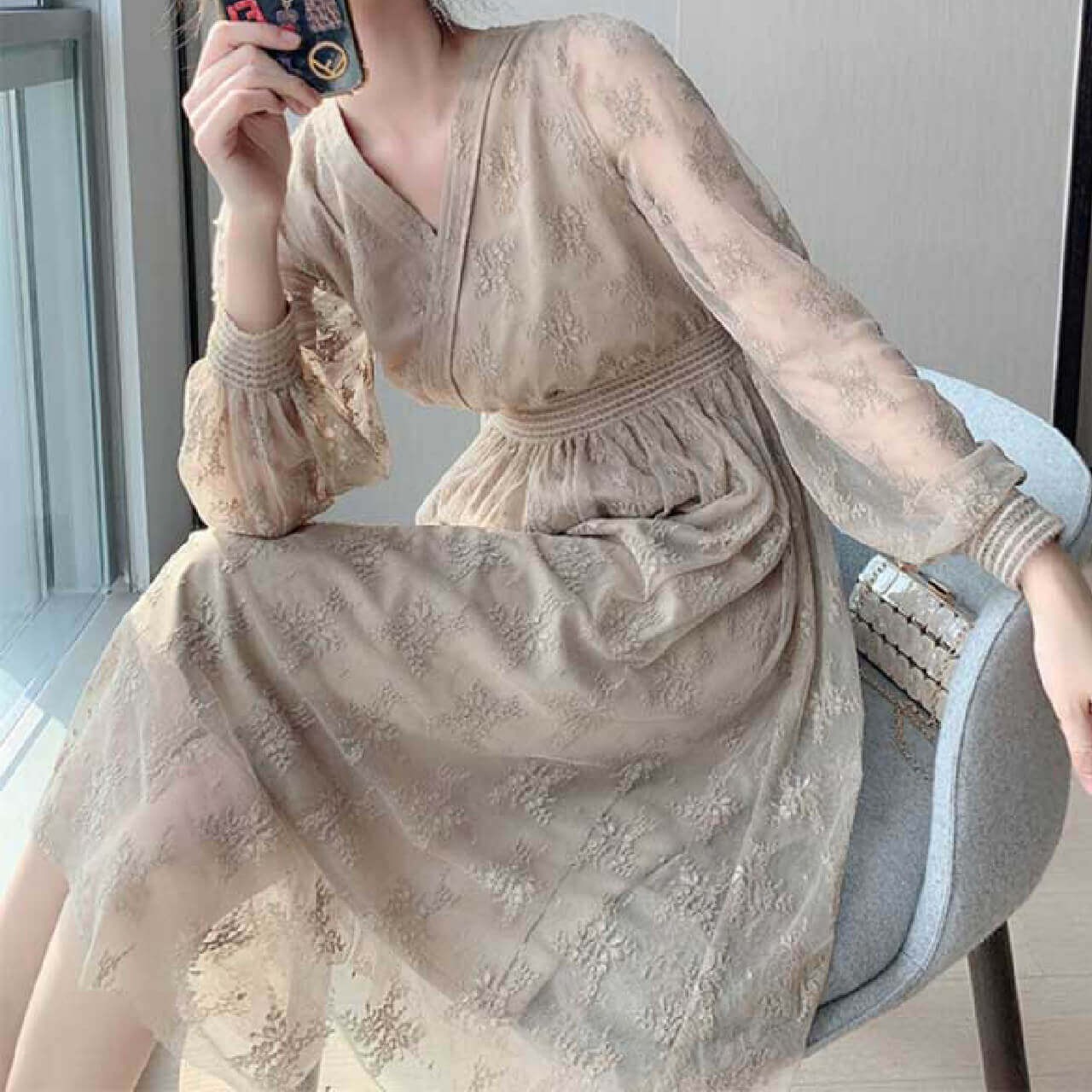 花の刺繍が丁寧に入ったミモレ丈のドレス。花柄がとても可愛いらしいです♪